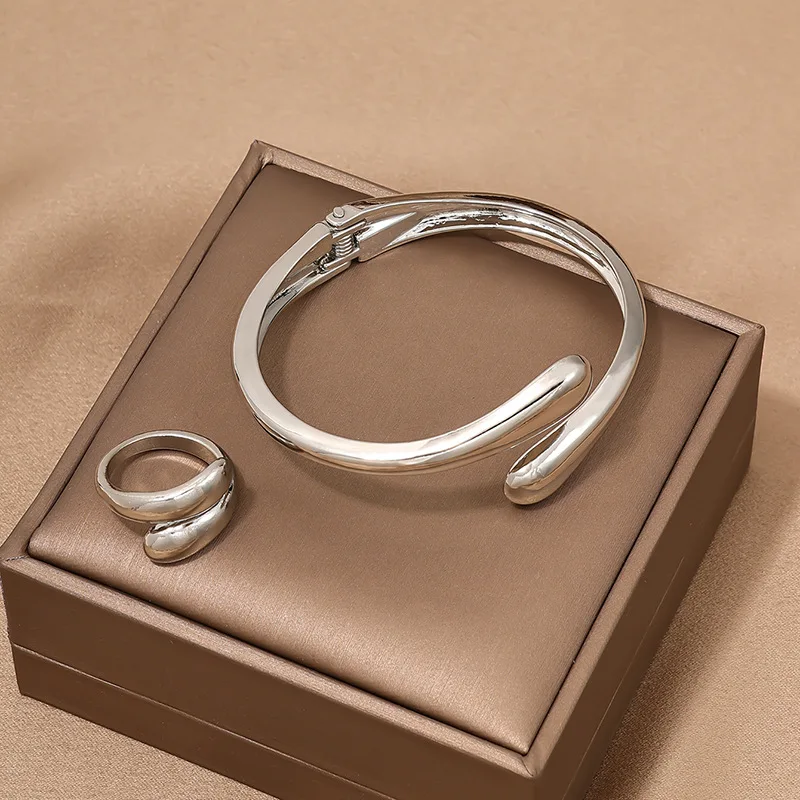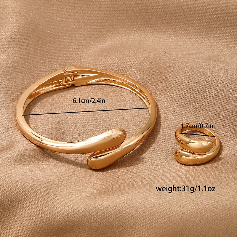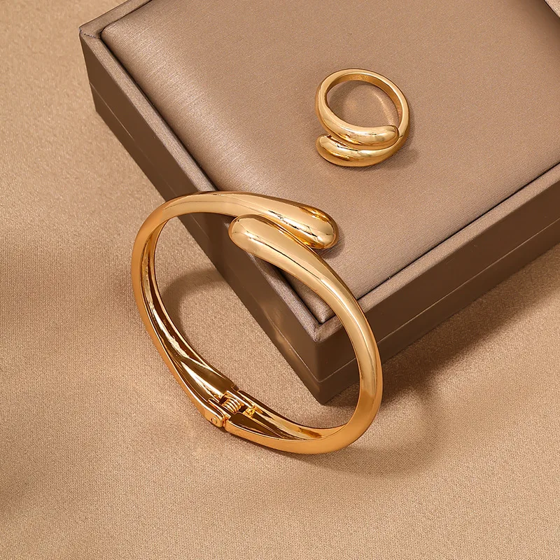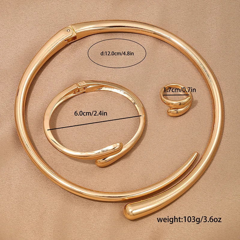 3 قطعة طوق معدني ناعم هندسي فاسق مع قلادة زنبركية مفتوحة للنساء مجموعة مجوهرات خاتم أساور ذهبية اللون بسيطة